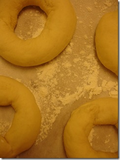Dela degen i 20 lika stora delar, rulla varje del till en ca 30 cm lång degbit och foga samman den till en ring. Se till att ändarna fäster ordentligt i varandra så att skarven inte lossnar o öppnar sig vid jäsning o gräddning. Lägg ringarna på en plåt med mjölat bakplåtspapper och låt dom jäsa i 30 minuter.